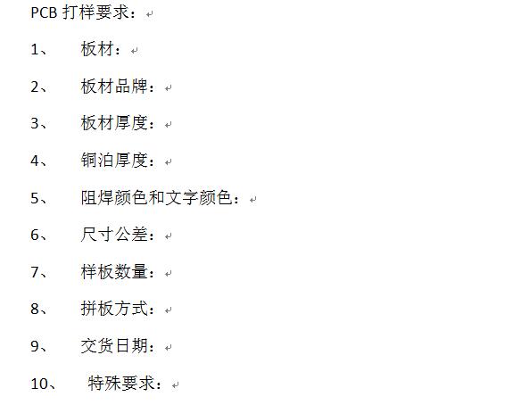 1、板材 2、板材品牌 3、板材厚度 4、pcb銅皮厚度 5、阻焊顏色,文字顏色 6、特別的層說(shuō)明以及制做要求說(shuō)明(例如你的SOLDER MARSK是放在哪一層,鍍金還是噴錫、或是OSP) 7、尺寸公差 8、樣板數(shù)量 9、拼板方式,是否需要加工作邊 10、交貨日期等等